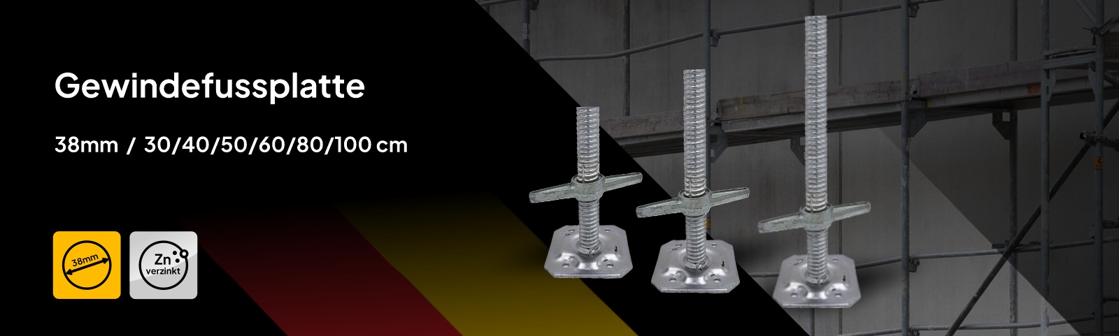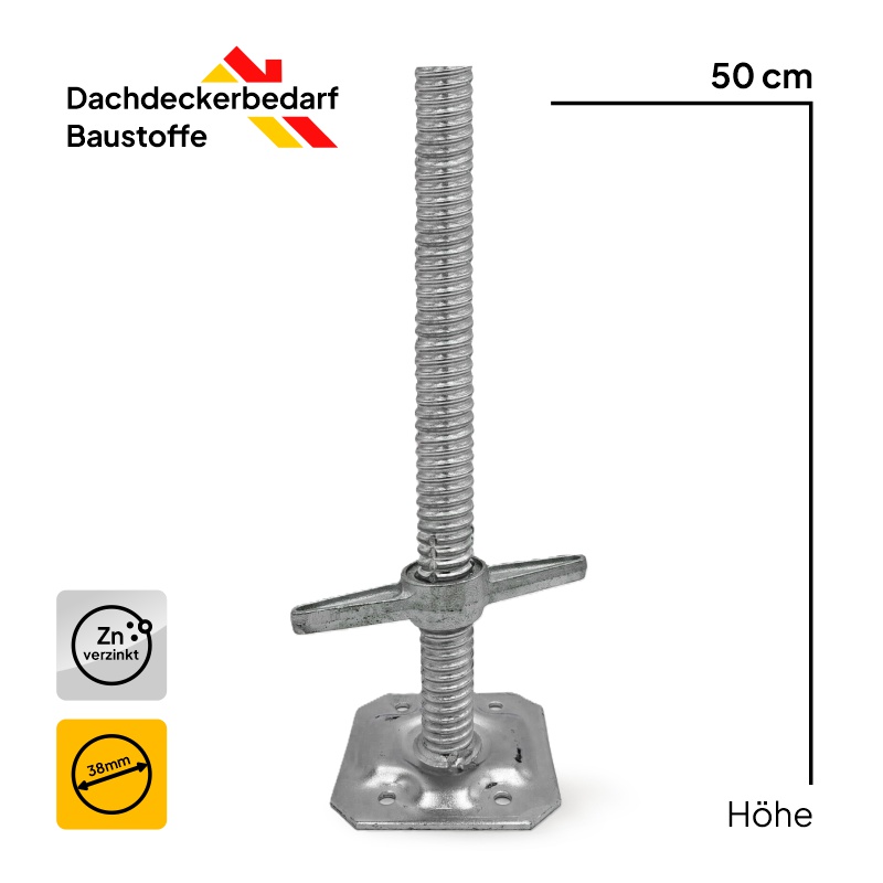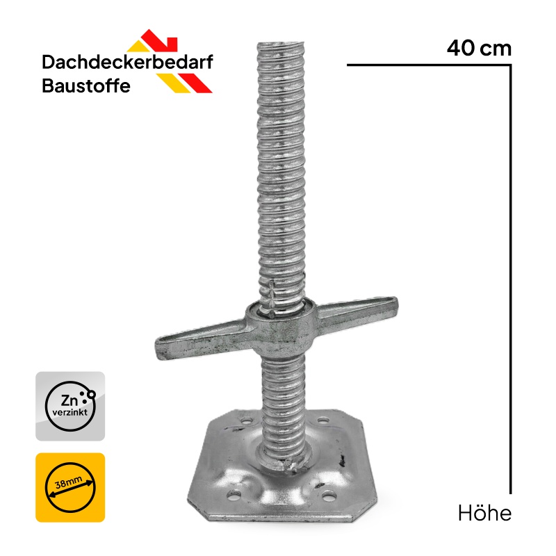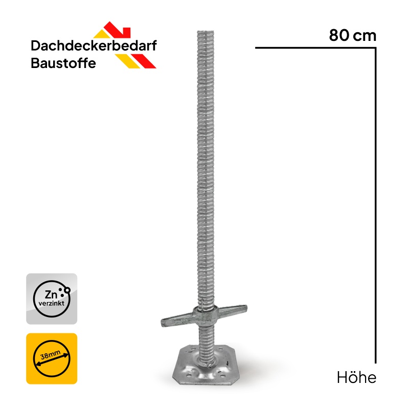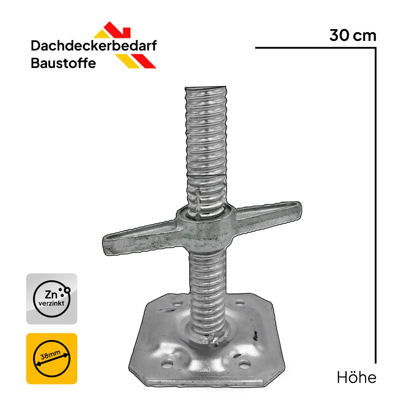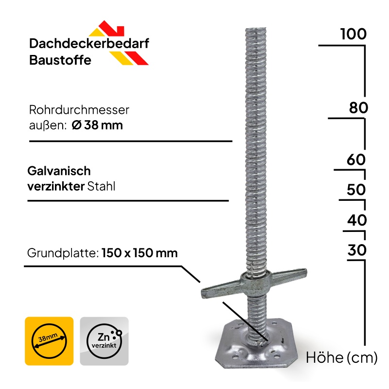 Mit einer Basis von 150 x 150 und einem Gewindestab in Rohrform (zweigängig, trapezförmig oder rund). Zur Ausgleichung kleiner Unebenheiten des Bodens stehen Füße in verschiedenen Längen zur Verfügung. Es ist zu beachten, dass 25 % des Gewindestabes, jedoch mindestens 15 cm, im Rahmen verbleiben müssen.