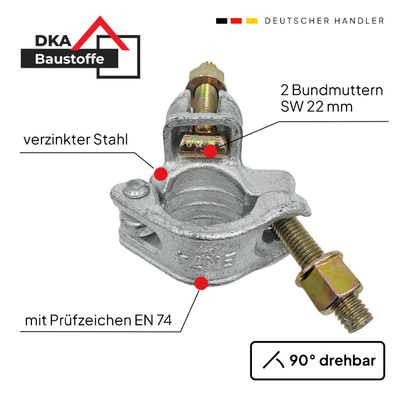 Anwendung: Diese Kupplung dient zur Verbindung von Gerüstbauteilen. Als sogenannte Normalkupplung sorgt sie für eine feste, rechtwinklige Verbindung (90°) zwischen zwei Gerüstrohren. Ideal für vielfältige Konstruktionen im Gerüstbau.