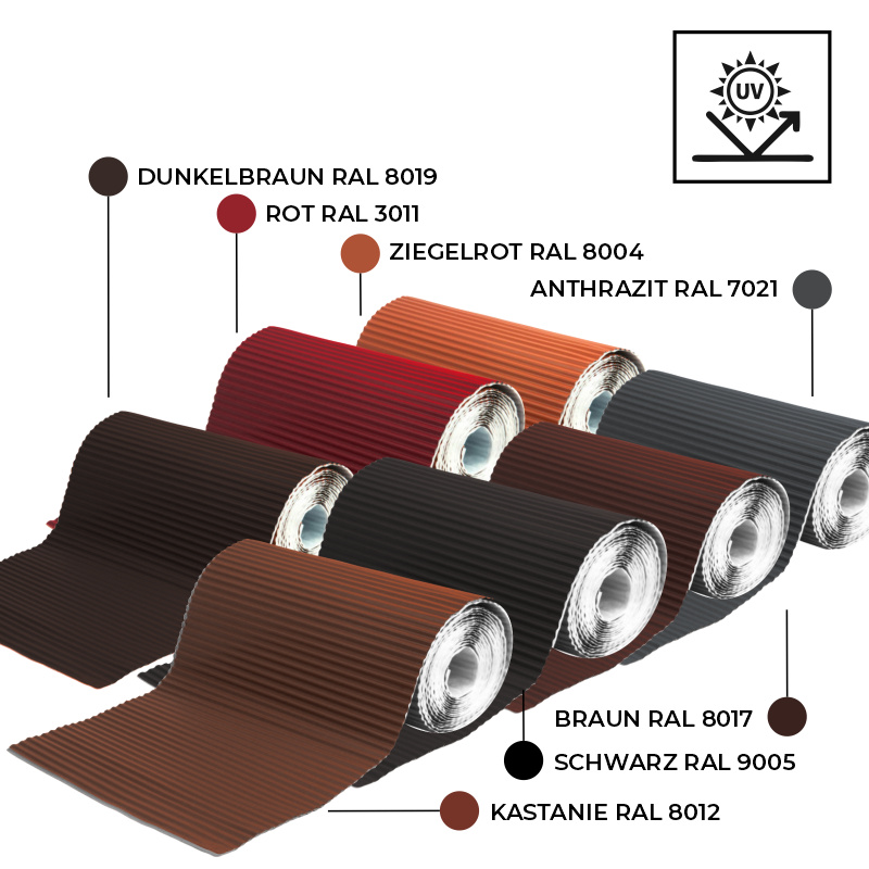Das Band aus einer Schicht des plissierten Aluminiums. Auf der Innenseite vollständig mit hochwertigm Butyl-Klebstoff abgedeckt.
